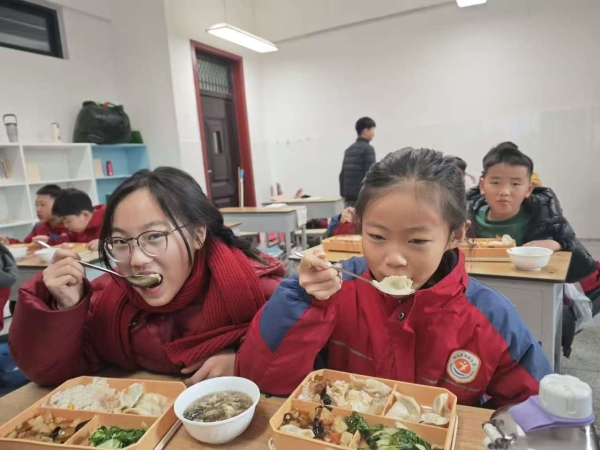 冬至饺子香,温暖满校园。同学们在老师的指导下,纷纷挽起袖子,大展身手。有的负责擀皮,有的负责包馅,大家分工明确,配合默契,欢声笑语此起彼伏,气氛热烈非凡。不一会儿,色彩斑斓、形态各异的饺子便摆满了桌面,有元宝状的、月牙状的,还有花朵状的,创意十足。当热气腾腾的饺子端上桌,同学们品尝着自己亲手包的饺子,脸上洋溢着幸福的笑容。