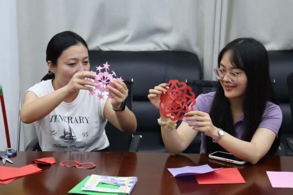 活动现场暖意融融,参与者有序领取剪刀、彩纸等工具后,结合自身兴趣与特长,或投身剪纸,或专注折纸。指尖灵动翻飞间,普通红纸焕发新生。精美的爱心窗花跃然纸上,部分作品还巧妙融入花朵等七夕元素,尽显传统剪纸艺术魅力;可爱的玉兔、小船等折纸造型也相继成型,憨态可掬。现场欢声笑语不断,大家手捧亲手制作的作品,满脸喜悦地相互展示、分享,既传递着创作的快乐,也借作品寄托了对美好生活的真挚祝福。