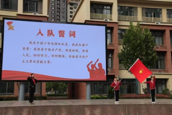 新队员代表在发言中表达了对成为一名少先队员的光荣感和使命感。“从今天起,我要以少先队员的标准严格要求自己,努力学习,热爱集体,遵守纪律,做一名优秀的少先队员。”稚嫩的声音充满了坚定的决心。 随后,大队辅导员带领全体新队员在队旗下庄严宣誓。“我是中国少年先锋队队员。我在队旗下宣誓:我热爱中国共产党,热爱祖国,热爱人民,好好学习,好好锻炼,准备着:为共产主义事业贡献力量!”铿锵有力的誓言在校园里久久回荡。