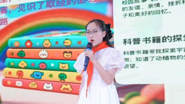 参赛选手们怀揣着对书籍的热爱与对阅读的感悟依次登台,他们用生动的语言、真挚的情感,讲述着自己与书的故事。很多同学声情并茂地讲述了自己从不爱读书的孩子,在老师的引导下逐渐爱上阅读的过程。他们精彩的演讲不仅展现了他们丰富的阅读积累和良好的语言表达能力,也让台下的观众们感受到了书籍的魅力和阅读的力量。有的同学讲述了经典名著如何在困境中给予自己勇气和信心;有的同学畅谈阅读如何开阔视野,帮助自己认识世界;还有的同学表达了从书中汲取的道德力量和人生启迪,展现了阅读对塑造品格的积极影响。更有的选手分享了在经典名著中领略到的历史风云变幻,有的则畅谈了从童话世界中汲取的温暖与勇气,还有的讲述了在励志书籍的激励下如何克服困难、奋勇前行。