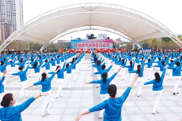 近日,全国老年人健身广场舞大联动 市驿城区分会场启动仪式在河南省老年健身示范园暨驿城区体育文化广场隆重举行,来自全区30支广场舞蹈队的300多名队员参加此次活动。( 日报记者 吴勇峰 摄)