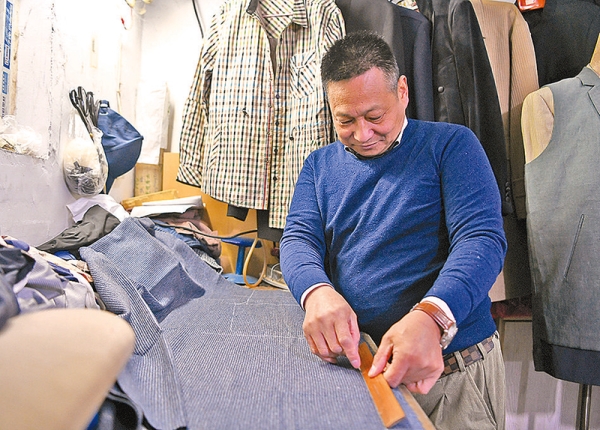 12月11日早晨,石学明准时拄着手杖到地下室,开始制衣。石学明住在5楼,为了不打扰邻居,他把缝纫机搬到15平方米的地下室。