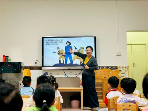 中班开展“听英雄故事,学做小卫士”活动。老师们借助生动的红色绘本,用童趣化的语言,讲述着九一八事变的历史片段。孩子们听得津津有味,他们的小脑袋里充满了对英雄的敬佩。随后,孩子们变身“小卫士”,用积木搭建起心中的“家园”,并用心守护。在这个过程中,他们在欢乐中感知英雄精神,一颗颗勇敢与责任的种子悄然种下,爱国情怀也在他们幼小的心灵中开始萌芽。