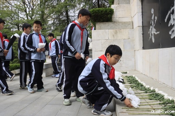 在鲜艳的党旗和队旗下,全体党员在副校长赵红霞的带领下重温入党誓词,少先队员在大队辅导员陈盼盼老师的引领中庄严宣誓。坚定的誓言与稚嫩的童声交织共鸣,在苍松翠柏间久久回荡。仪式结束后,师生手持自制白花缓步绕行烈士墓区,朵朵素花寄托着绵绵追思。